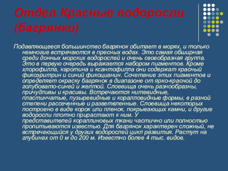 только немногие встречаются в пресных водах. Это самая обширная среди донных морских водорослей и очень своеобразная группа. Это в первую очередь выражается набором пигментов. Кроме хлорофилла, каротина и ксантофилла они содержат красный фикоэритрин и синий фикоцианин. Сочетание этих пигментов и определяет окраску багрянок в диапазоне от ярко-красной до голубовато-синей и желтой. Слоевища очень разнообразны, причудливы и красивы. Встречаются нитевидные, пластинчатые, пузыревидные и коралловидные формы, в разной степени рассеченные и разветвленные. Слоевища некоторых построено в виде корок или пленок, покрывающих камни, и другие водоросли плотно прирастают к ним. У представителей кораллиновых ткани частично или полностью пропитываются известью. Для багрянок характерен сложный, не встречающийся у других водорослей цикл развития. Растут на глубинах от 0 м до 200 м. Известно более 4 тыс. видов.