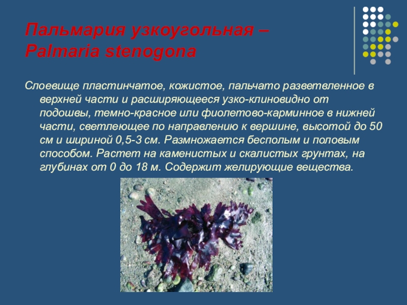 и расширяющееся узко-клиновидно от подошвы, темно-красное или фиолетово-карминное в нижней части, светлеющее по направлению к вершине, высотой до 50 см и шириной 0,5-3 см. Размножается бесполым и половым способом. Растет на каменистых и скалистых грунтах, на глубинах от 0 до 18 м. Содержит желирующие вещества.
