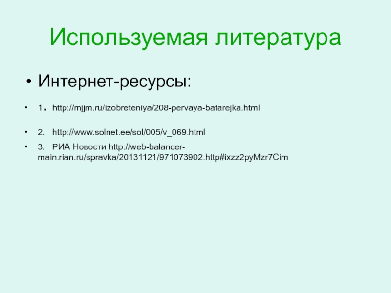 1. http://mjjm.ru/izobreteniya/208-pervaya-batarejka.html