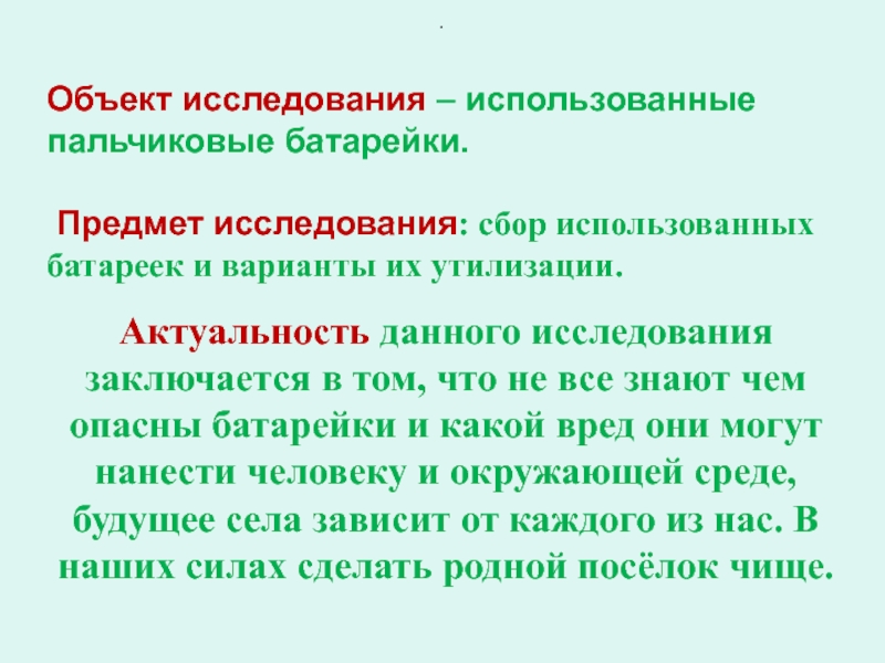 Предмет исследования: сбор использованных батареек и варианты их утилизации.
