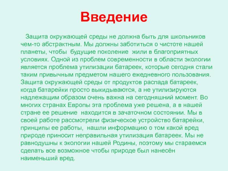 быть для школьников чем-то абстрактным. Мы должны заботиться о чистоте нашей планеты, чтобы будущие поколение жили в благоприятных условиях. Одной из проблем современности в области экологии является проблема утилизации батареек, которые сегодня стали таким привычным предметом нашего ежедневного пользования. Защита окружающей среды от продуктов распада батареек, когда батарейки просто выкидываются, а не утилизируются надлежащим образом очень важна на сегодняшний момент. Во многих странах Европы эта проблема уже решена, а в нашей стране ее решение находится в зачаточном состоянии. Мы в своей работе рассмотрели физическое устройство батарейки, принципы ее работы, нашли информацию о том какой вред природе приносит неправильная утилизация батареек. Мы не равнодушны к экологии нашей Родины, поэтому мы стараемся сделать все возможное чтобы природе был нанесён наименьший вред.