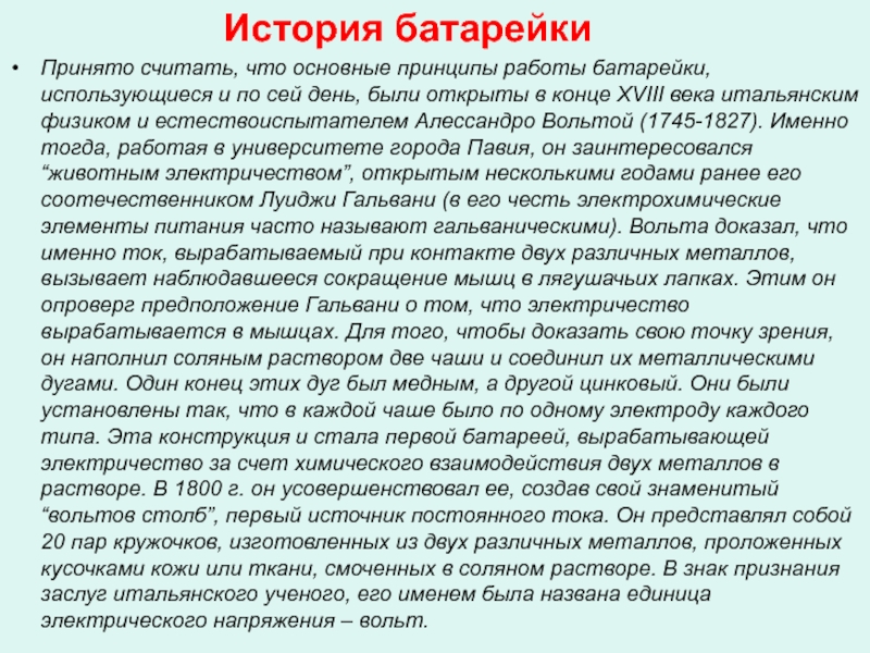 Принято считать, что основные принципы работы батарейки, использующиеся и по сей день, были открыты в конце XVIII века итальянским физиком и естествоиспытателем Алессандро Вольтой (1745-1827). Именно тогда, работая в университете города Павия, он заинтересовался “животным электричеством”, открытым несколькими годами ранее его соотечественником Луиджи Гальвани (в его честь электрохимические элементы питания часто называют гальваническими). Вольта доказал, что именно ток, вырабатываемый при контакте двух различных металлов, вызывает наблюдавшееся сокращение мышц в лягушачьих лапках. Этим он опроверг предположение Гальвани о том, что электричество вырабатывается в мышцах. Для того, чтобы доказать свою точку зрения, он наполнил соляным раствором две чаши и соединил их металлическими дугами. Один конец этих дуг был медным, а другой цинковый. Они были установлены так, что в каждой чаше было по одному электроду каждого типа. Эта конструкция и стала первой батареей, вырабатывающей электричество за счет химического взаимодействия двух металлов в растворе. В 1800 г. он усовершенствовал ее, создав свой знаменитый “вольтов столб”, первый источник постоянного тока. Он представлял собой 20 пар кружочков, изготовленных из двух различных металлов, проложенных кусочками кожи или ткани, смоченных в соляном растворе. В знак признания заслуг итальянского ученого, его именем была названа единица электрического напряжения – вольт.