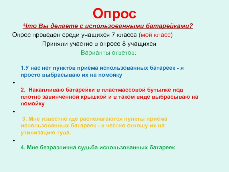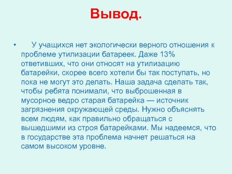 отношения к проблеме утилизации батареек. Даже 13% ответивших, что они относят на утилизацию батарейки, скорее всего хотели бы так поступать, но пока не могут это делать. Наша задача сделать так, чтобы ребята понимали, что выброшенная в мусорное ведро старая батарейка — источник загрязнения окружающей среды. Нужно объяснять всем людям, как правильно обращаться с вышедшими из строя батарейками. Мы надеемся, что в государстве эта проблема начнет решаться на самом высоком уровне.