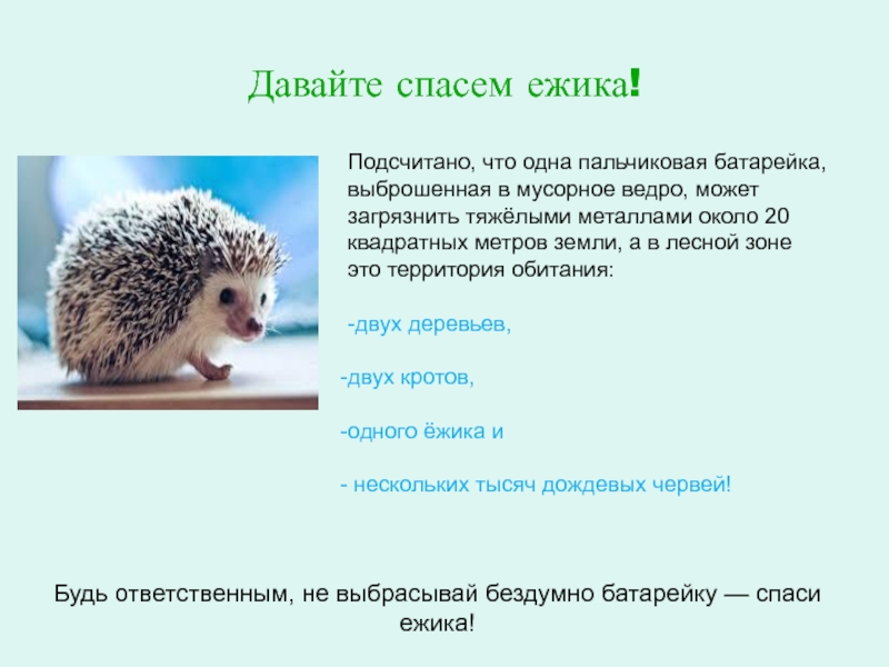 Будь ответственным, не выбрасывай бездумно батарейку — спаси ежика!