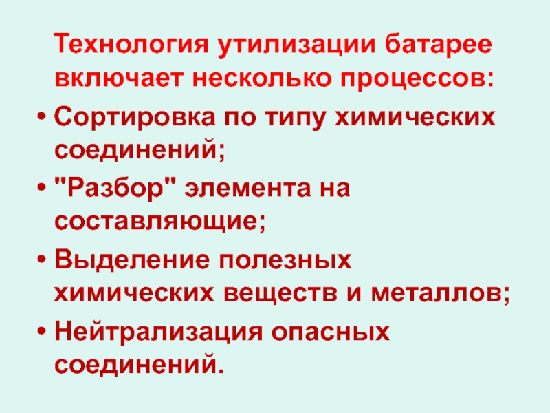 Технология утилизации батарее включает несколько процессов: