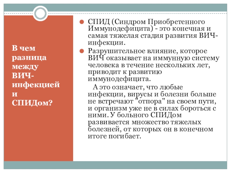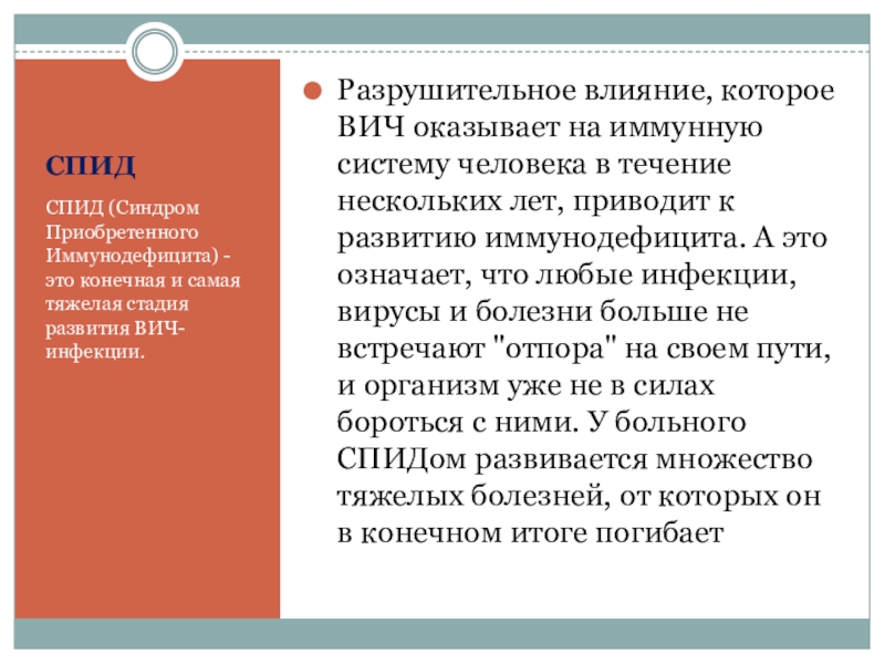 Разрушительное влияние, которое ВИЧ оказывает на иммунную систему человека в течение нескольких лет, приводит к развитию иммунодефицита. А это означает, что любые инфекции, вирусы и болезни больше не встречают "отпора" на своем пути, и организм уже не в силах бороться с ними. У больного СПИДом развивается множество тяжелых болезней, от которых он в конечном итоге погибает