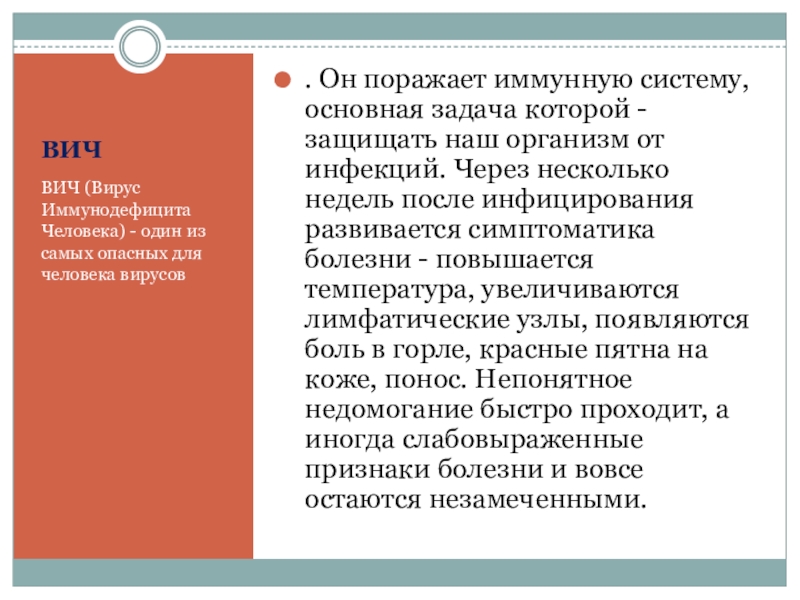 . Он поражает иммунную систему, основная задача которой - защищать наш организм от инфекций. Через несколько недель после инфицирования развивается симптоматика болезни - повышается температура, увеличиваются лимфатические узлы, появляются боль в горле, красные пятна на коже, понос. Непонятное недомогание быстро проходит, а иногда слабовыраженные признаки болезни и вовсе остаются незамеченными.