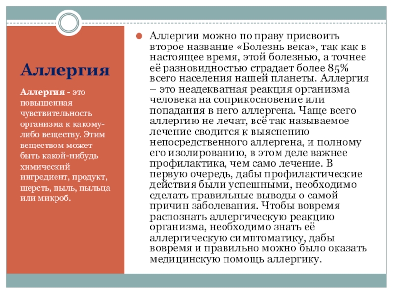 Аллергии можно по праву присвоить второе название «Болезнь века», так как в настоящее время, этой болезнью, а точнее её разновидностью страдает более 85% всего населения нашей планеты. Аллергия – это неадекватная реакция организма человека на соприкосновение или попадания в него аллергена. Чаще всего аллергию не лечат, всё так называемое лечение сводится к выяснению непосредственного аллергена, и полному его изолированию, в этом деле важнее профилактика, чем само лечение. В первую очередь, дабы профилактические действия были успешными, необходимо сделать правильные выводы о самой причин заболевания. Чтобы вовремя распознать аллергическую реакцию организма, необходимо знать её аллергическую симптоматику, дабы вовремя и правильно можно было оказать медицинскую помощь аллергику.