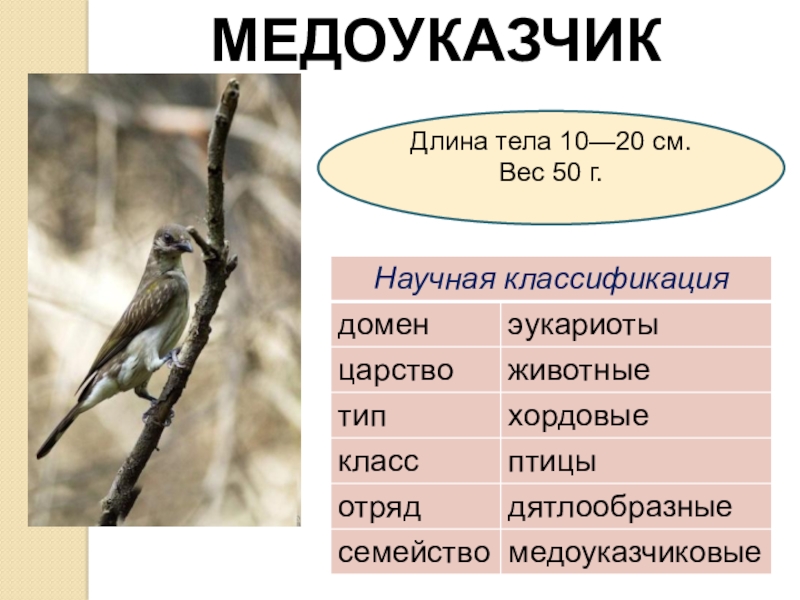 Длина тела 10—20 см. Вес 50 г.МЕДОУКАЗЧИК