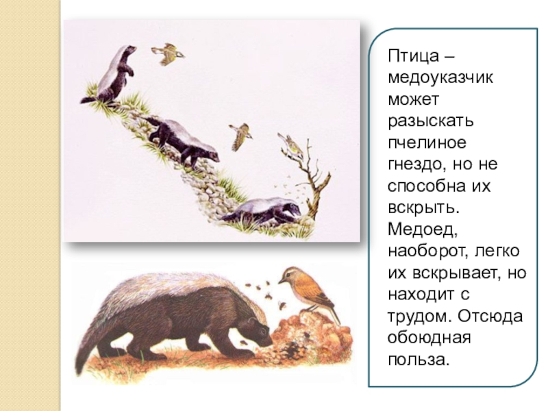 вскрыть. Медоед, наоборот, легко их вскрывает, но находит с трудом. Отсюда обоюдная польза.