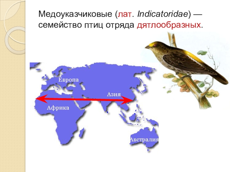 Слайд 2Медоуказчиковые (лат. Indicatoridae) — семейство птиц отряда дятлообразных.