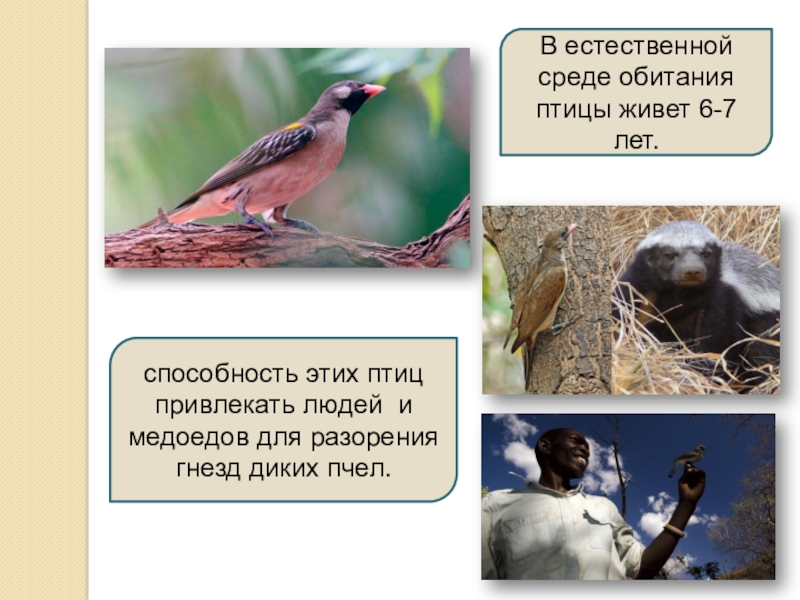 В естественной среде обитания птицы живет 6-7 лет.способность этих птиц привлекать людей и медоедов для разорения гнезд
