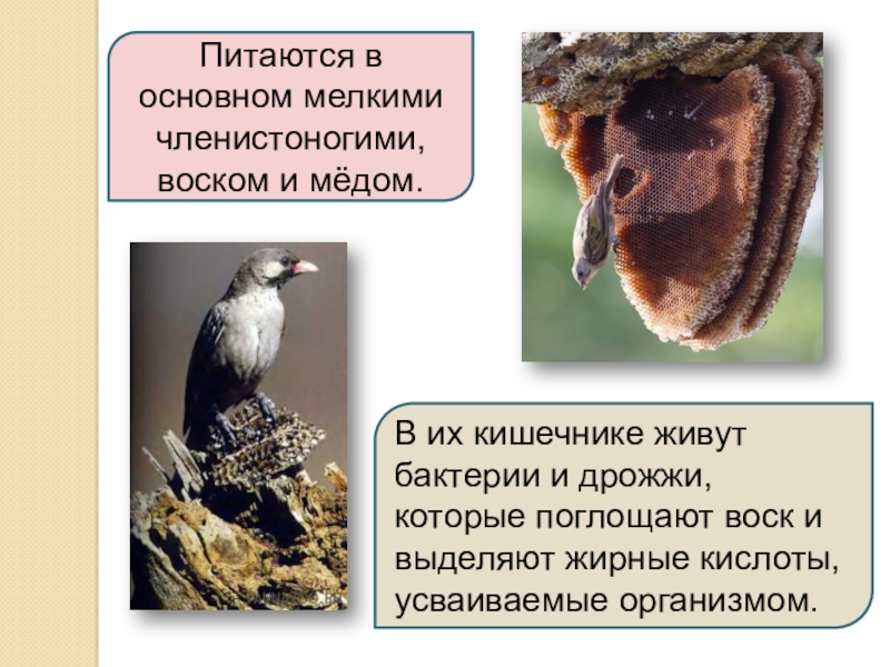 Слайд 5Питаются в основном мелкими членистоногими, воском и мёдом.