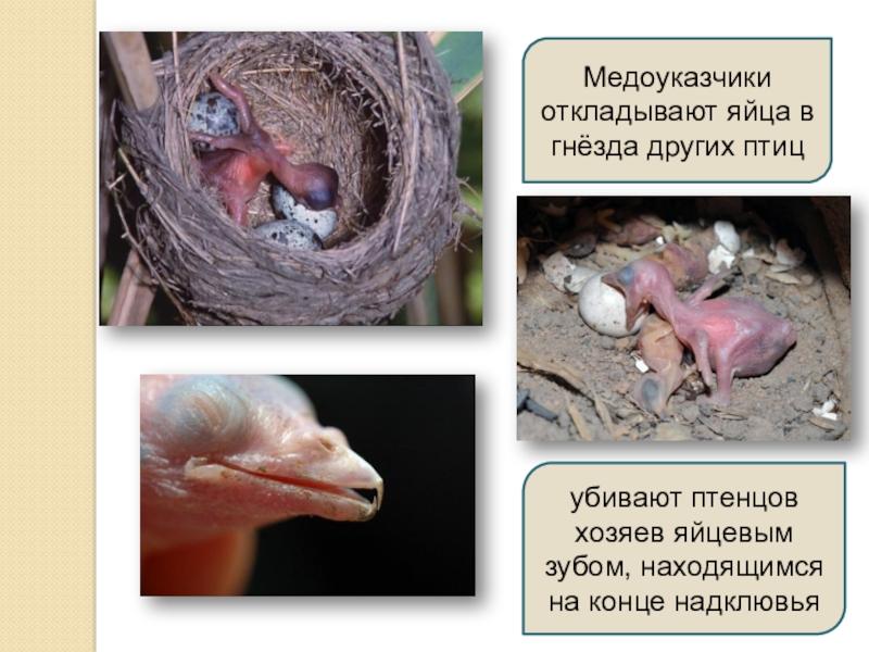 Слайд 11Медоуказчики откладывают яйца в гнёзда других птиц