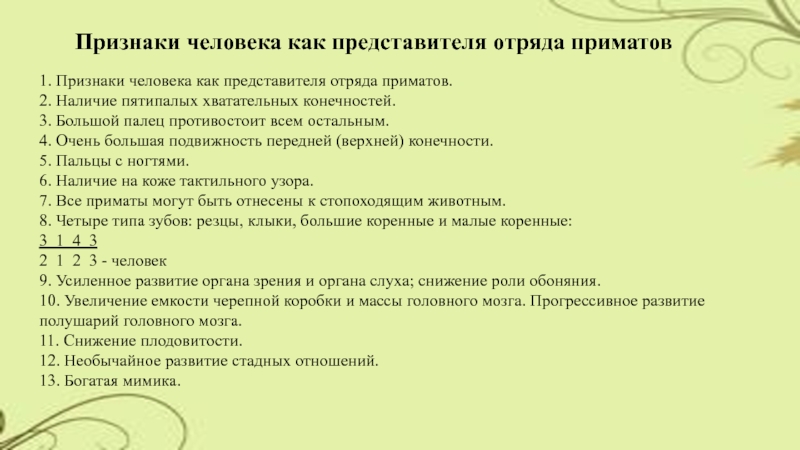1. Признаки человека как представителя отряда