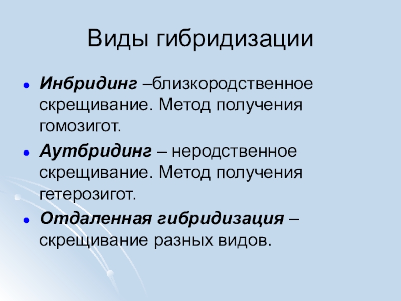 Виды гибридизацииИнбридинг –близкородственное скрещивание. Метод получения гомозигот.Аутбридинг – неродственное скрещивание. Метод получения гетерозигот.Отдаленная гибридизация – скрещивание разных