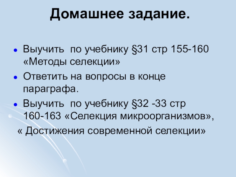 Домашнее задание. Выучить по учебнику §31 стр 155-160 «Методы селекции»Ответить на вопросы в конце параграфа.Выучить по учебнику
