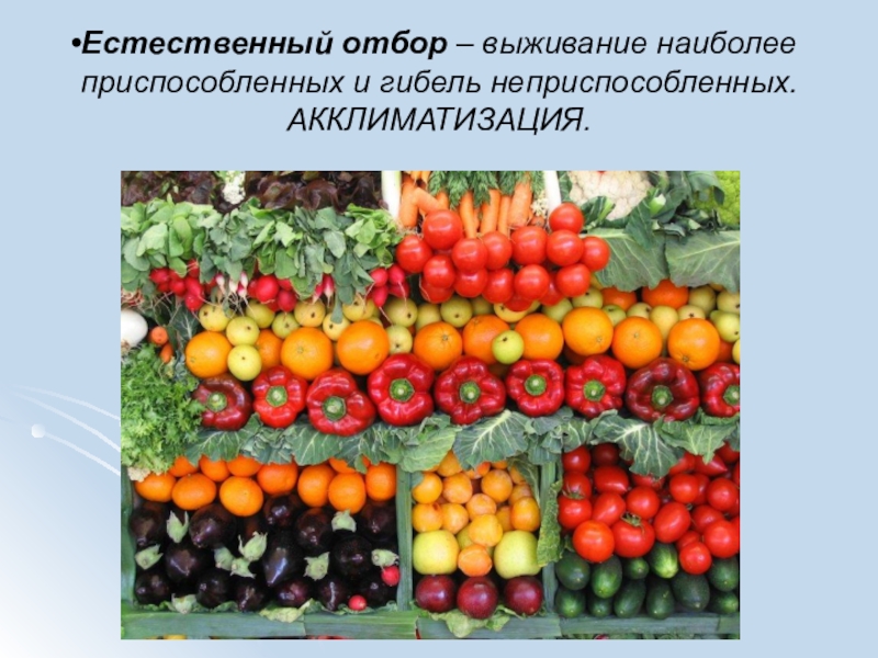 Естественный отбор – выживание наиболее приспособленных и гибель неприспособленных.  АККЛИМАТИЗАЦИЯ.
