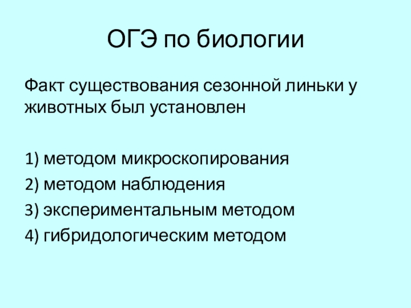 ОГЭ по биологииФакт существования сезонной линьки у животных был установлен 1) методом микроскопирования2) методом наблюдения3) экспериментальным методом4) гибридологическим