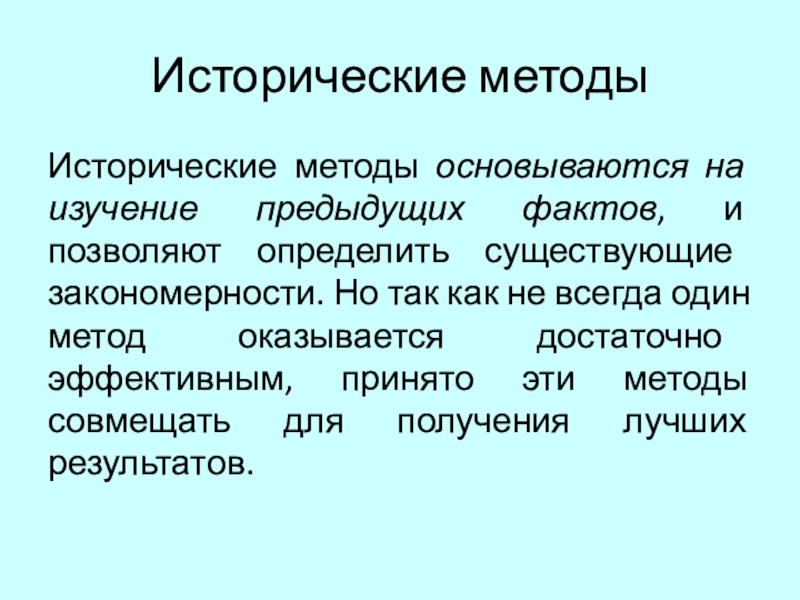 Исторические методыИсторические методы основываются на изучение предыдущих фактов, и позволяют определить существующие закономерности. Но так как не