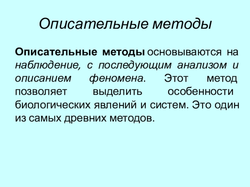 Описательные методыОписательные методы основываются на наблюдение, с последующим анализом и описанием феномена. Этот метод позволяет выделить особенности биологических