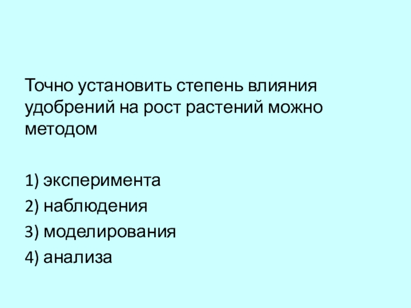 Точно установить степень влияния удобрений на рост растений можно методом 1) эксперимента2) наблюдения3) моделирования4) анализа