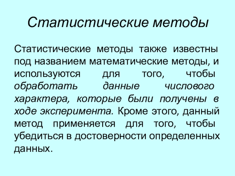 Статистические методыСтатистические методы также известны под названием математические методы, и используются для того, чтобы обработать данные числового