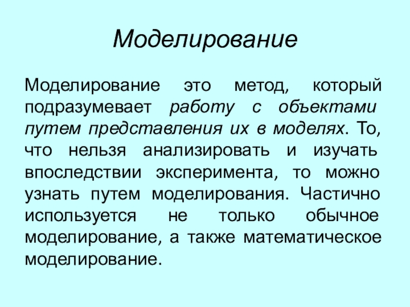 МоделированиеМоделирование это метод, который подразумевает работу с объектами путем представления их в моделях. То, что нельзя анализировать