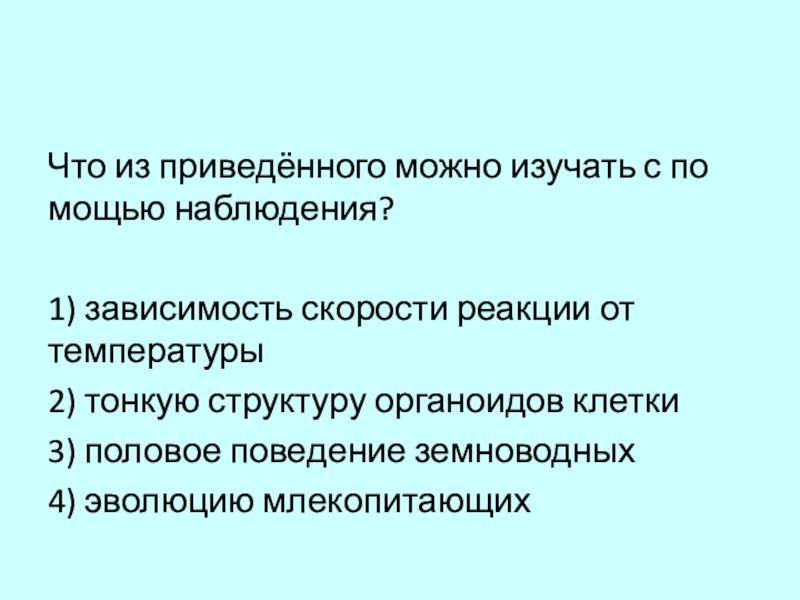 Что из приведённого можно изу­чать с по­мо­щью наблюдения? 1) зависимость ско­ро­сти ре­ак­ции от температуры2) тонкую струк­ту­ру ор­га­но­и­дов клетки3)
