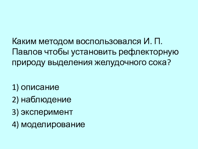 Каким методом воспользовался И. П. Павлов чтобы установить рефлекторную природу выделения желудочного сока? 1) описание2) наблюдение3) эксперимент4) моделирование