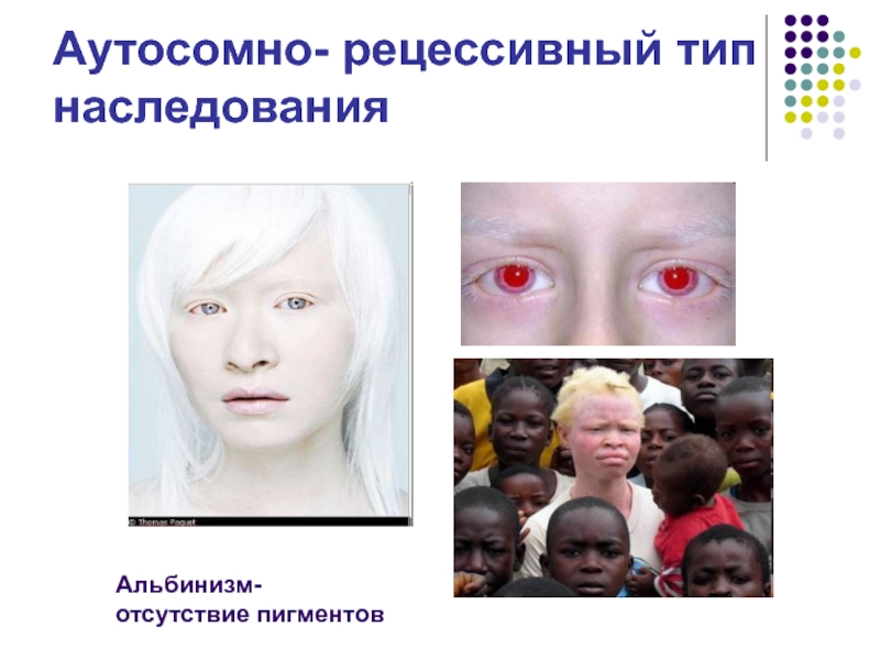 Аутосомно- рецессивный тип наследованияАльбинизм-  отсутствие пигментов