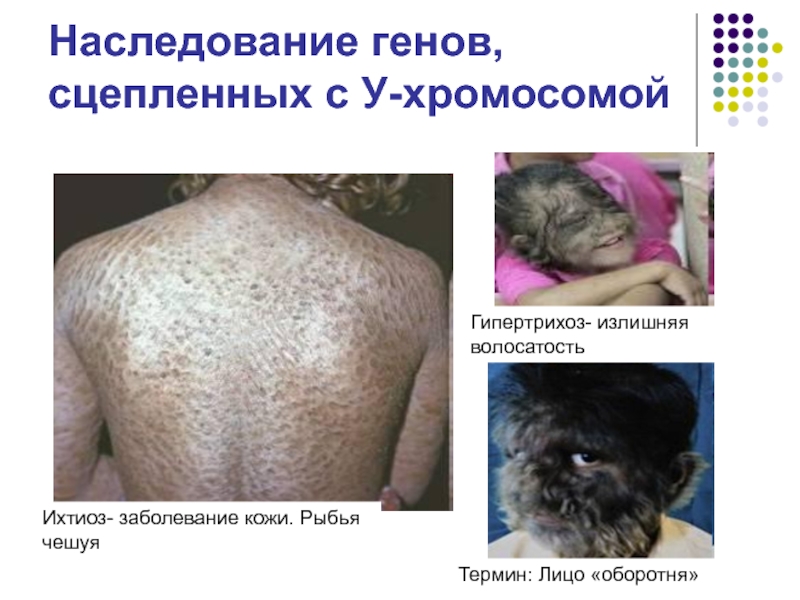 Наследование генов, сцепленных с У-хромосомойИхтиоз- заболевание кожи. Рыбья чешуяТермин: Лицо «оборотня»Гипертрихоз- излишняя волосатость