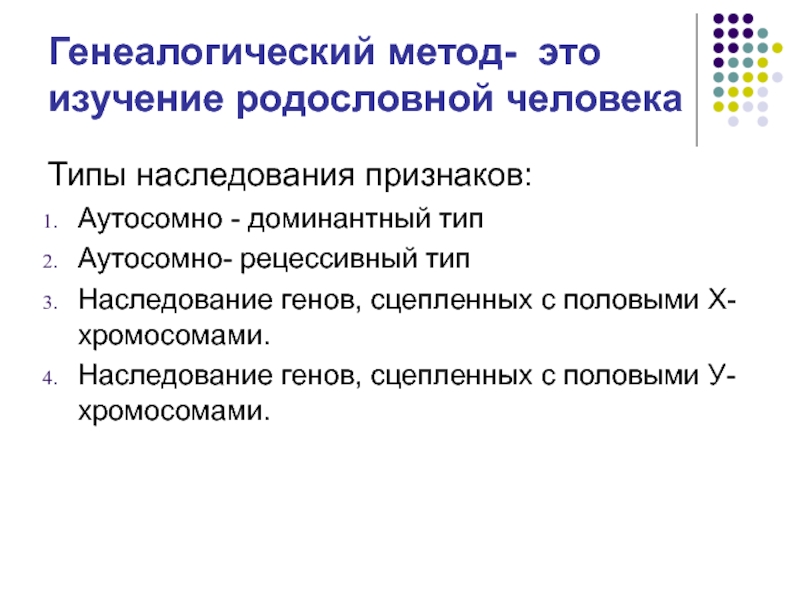 Генеалогический метод- это изучение родословной человекаТипы наследования признаков:Аутосомно - доминантный типАутосомно- рецессивный типНаследование генов, сцепленных с половыми