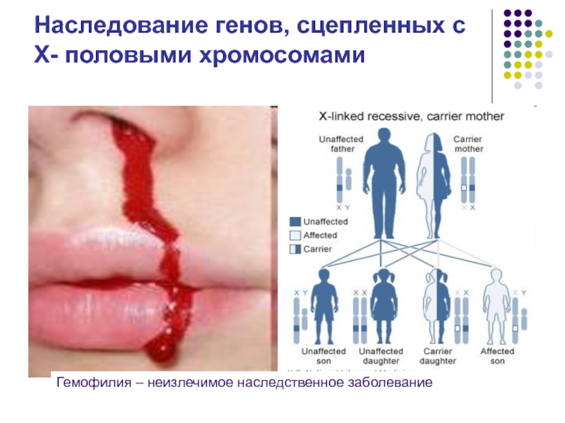 Наследование генов, сцепленных с Х- половыми хромосомамиГемофилия – неизлечимое наследственное заболевание
