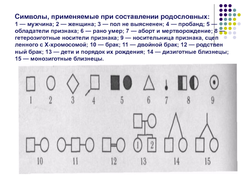 Слайд 2Символы, применяемые при составлении родословных: 1 — мужчина; 2 — женщина;