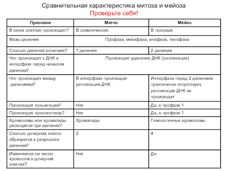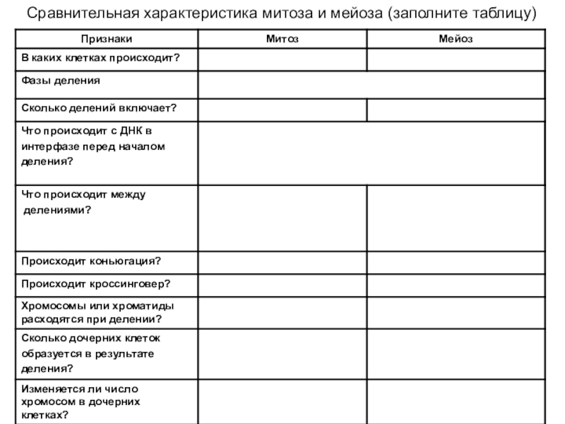 Слайд 30Сравнительная характеристика митоза и мейоза (заполните таблицу)