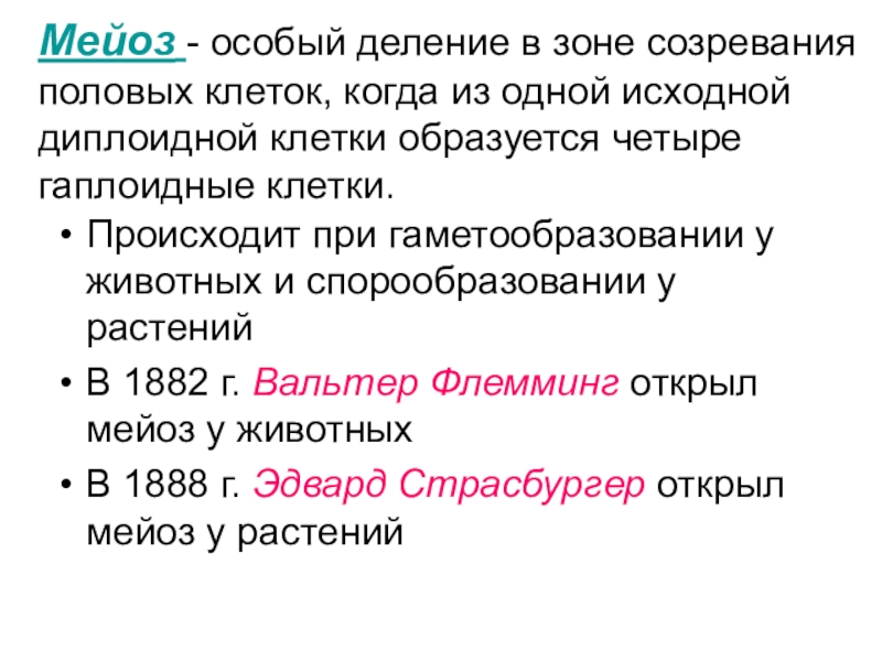 В 1882 г. Вальтер Флемминг открыл мейоз у животных
