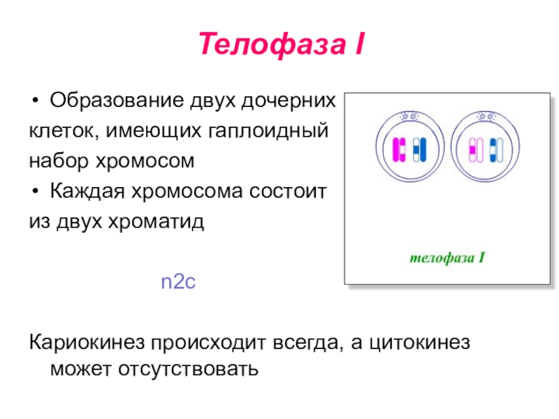 Редукция числа хромосом (уменьшение вдвое), у каждого полюса – одна хромосома из пары, состоящая из двух хроматид