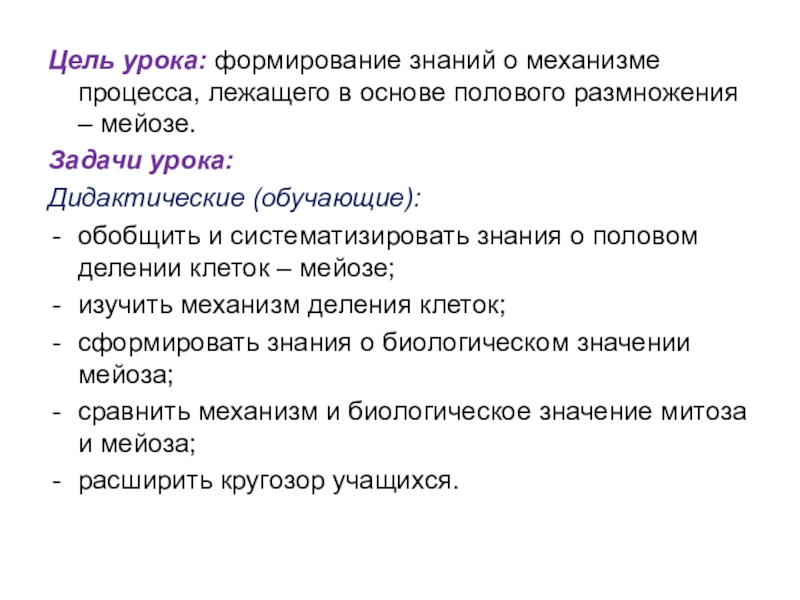 Слайд 7Цель урока: формирование знаний о механизме процесса, лежащего в основе полового
