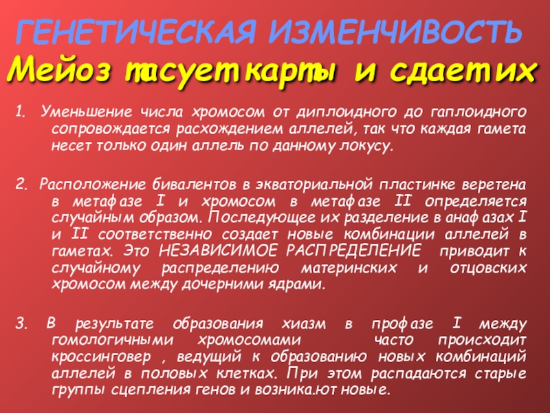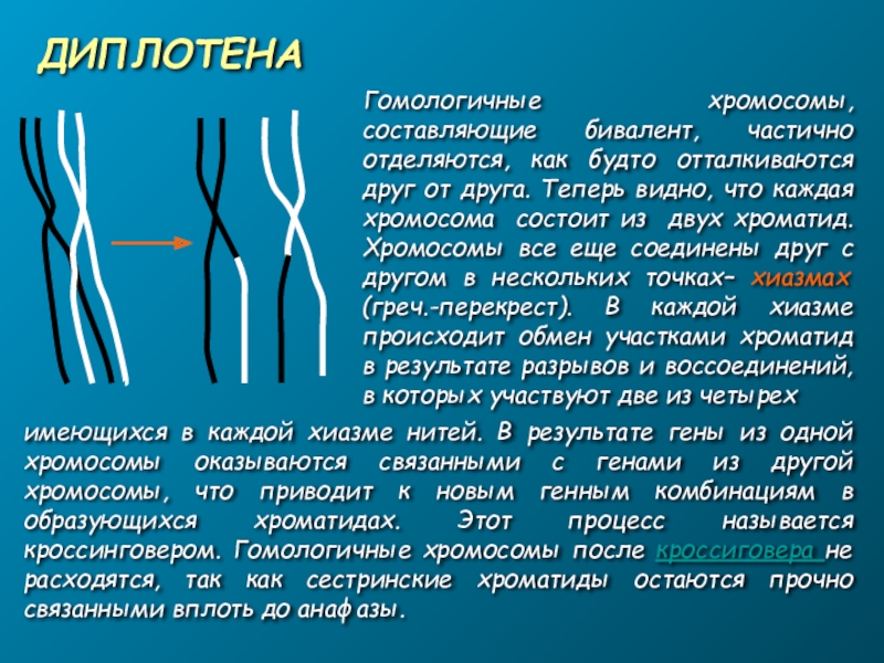 имеющихся в каждой хиазме нитей. В результате гены из одной хромосомы оказываются связанными с генами из другой хромосомы, что приводит к новым генным комбинациям в образующихся хроматидах. Этот процесс называется кроссинговером. Гомологичные хромосомы после кроссиговера не расходятся, так как сестринские хроматиды остаются прочно связанными вплоть до анафазы.