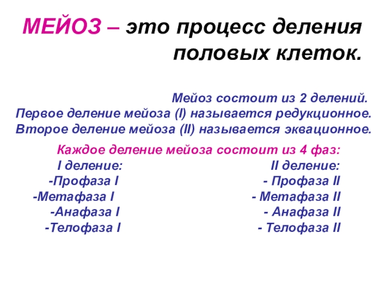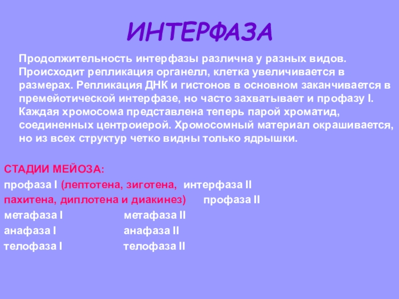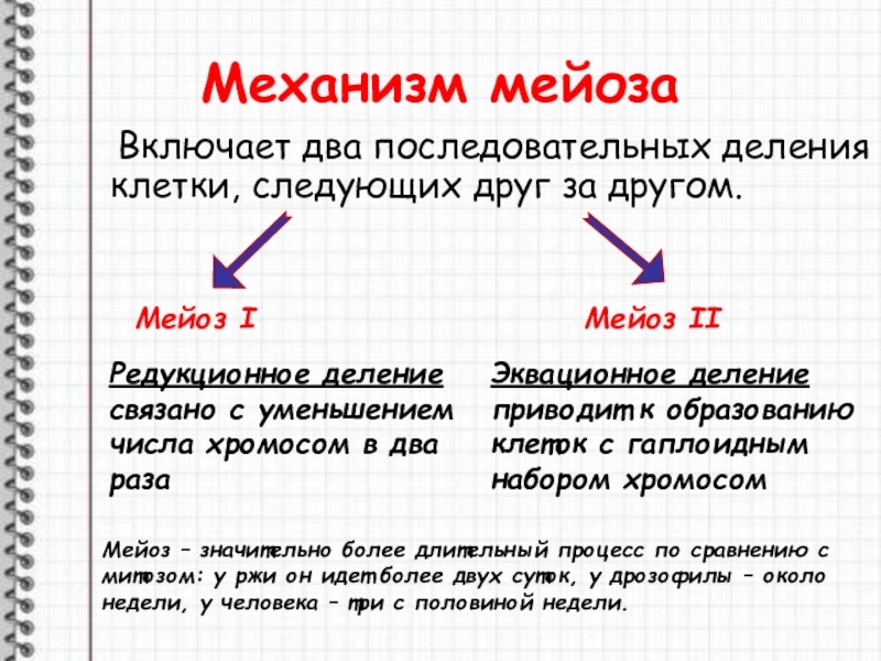 Мейоз – значительно более длительный процесс по сравнению с митозом: у ржи он идет более двух суток, у дрозофилы – около недели, у человека – три с половиной недели.