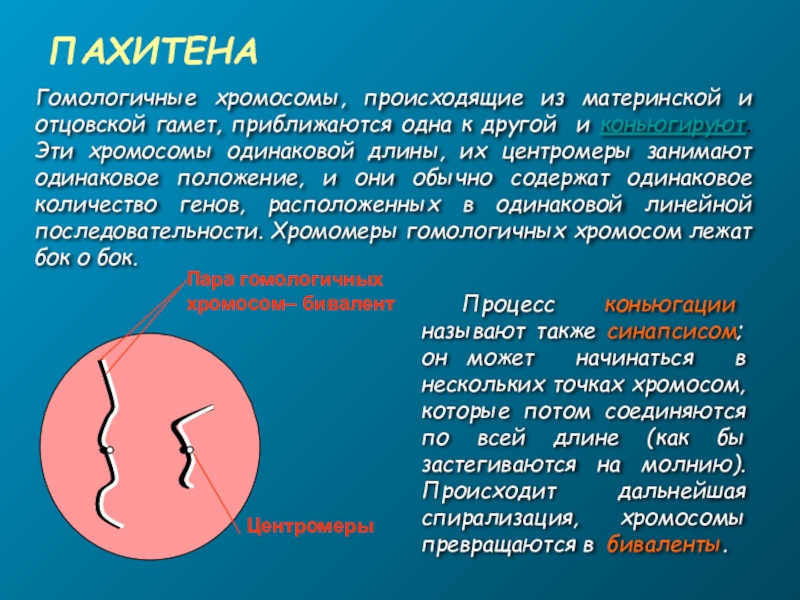 Процесс коньюгации называют также синапсисом; он может начинаться в нескольких точках хромосом, которые потом соединяются по всей длине (как бы застегиваются на молнию). Происходит дальнейшая спирализация, хромосомы превращаются в биваленты.