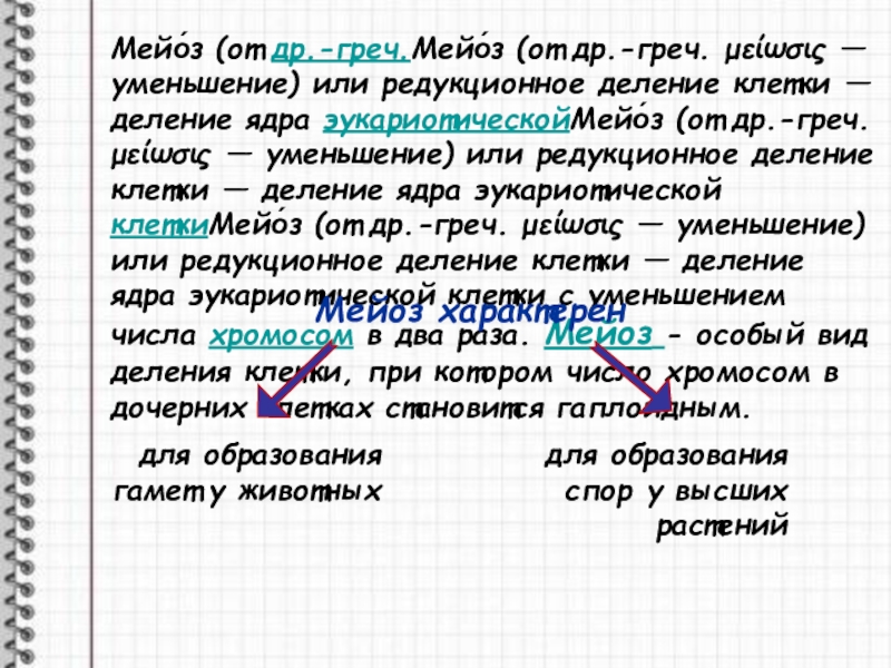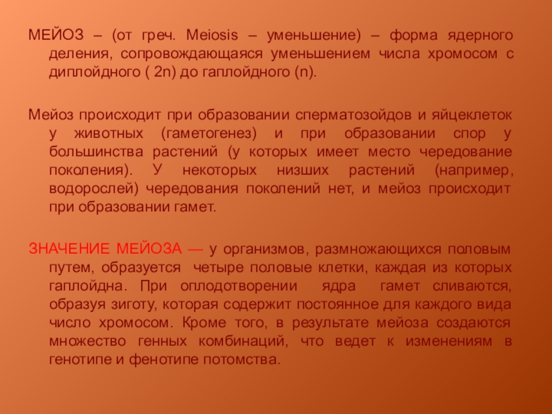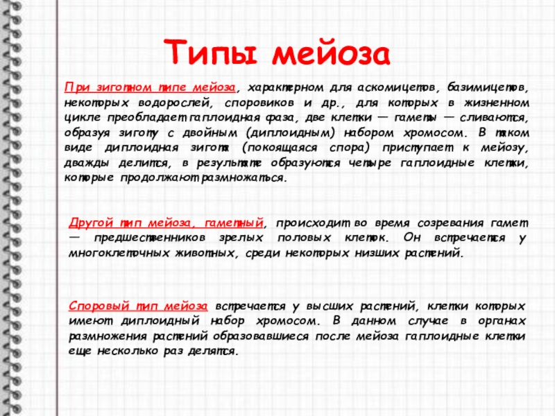 Другой тип мейоза, гаметный, происходит во время созревания гамет — предшественников зрелых половых клеток. Он встречается у многоклеточных животных, среди некоторых низших растений.