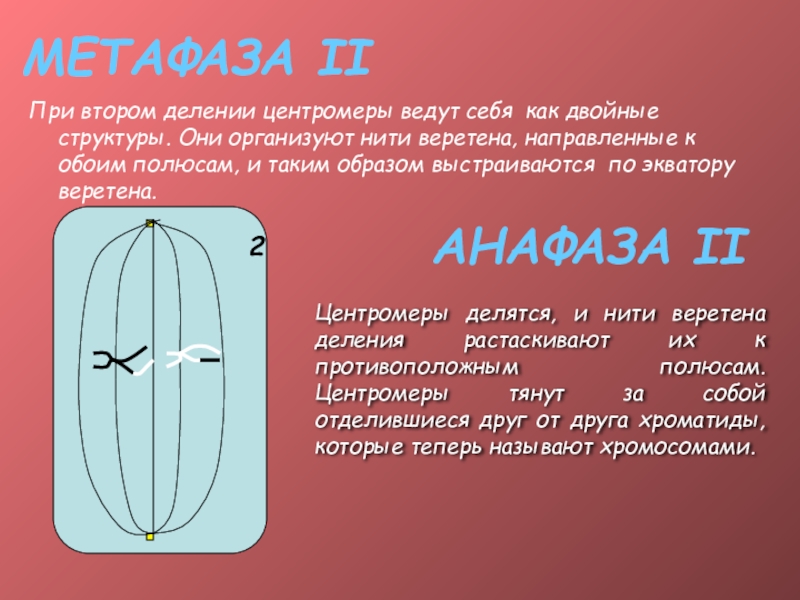 Центромеры делятся, и нити веретена деления растаскивают их к противоположным полюсам. Центромеры тянут за собой отделившиеся друг от друга хроматиды, которые теперь называют хромосомами.