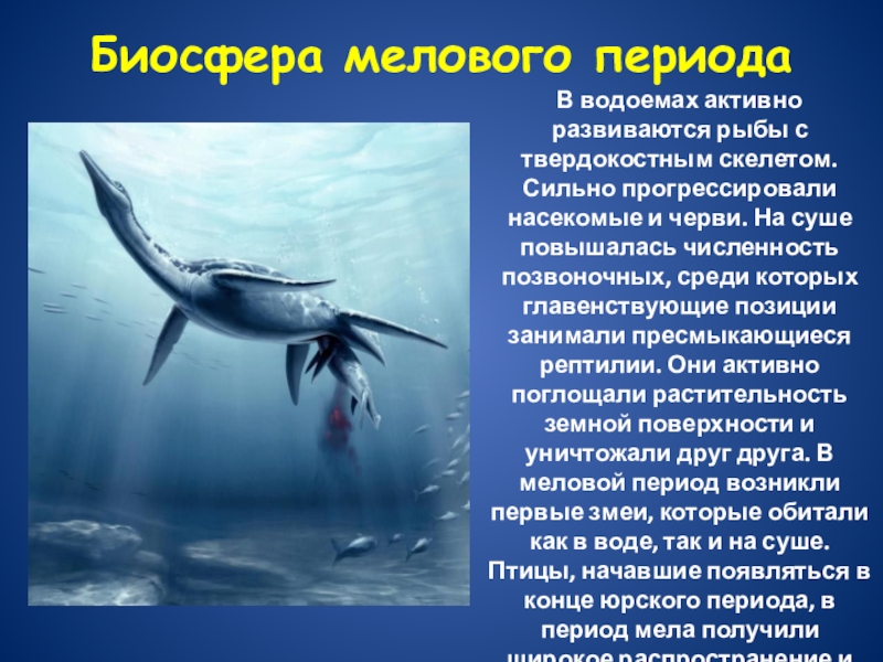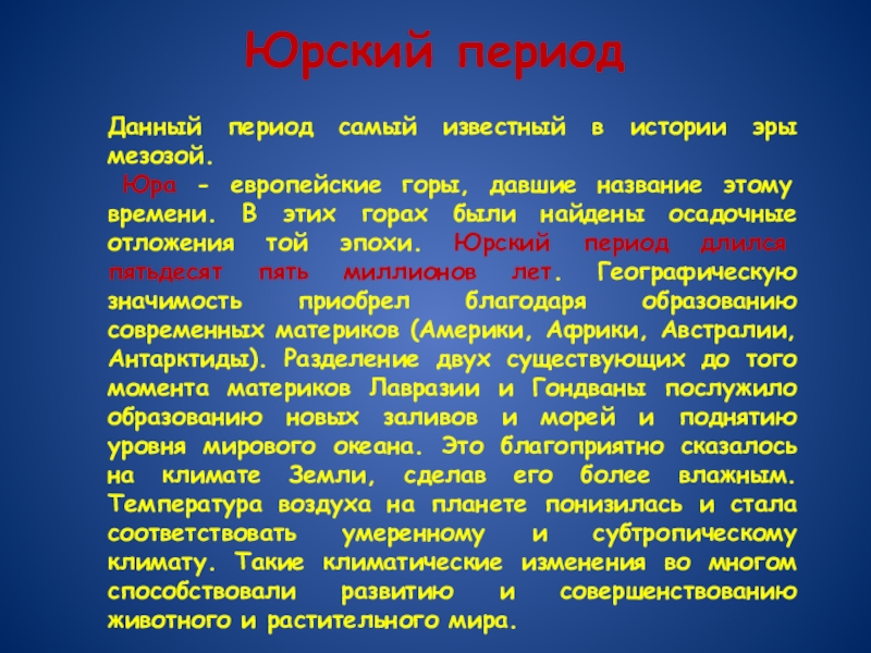 Мезозойская эра – время существенных изменений в земной коре и эволюционного прогресса. За 200 млн. лет сформировались основные континенты, горные цепи. Существенным было развитие жизни в мезозойскую эру. Благодаря теплым погодным условиям живая природа пополнилась новыми видами, которые стали предками современных представителей.