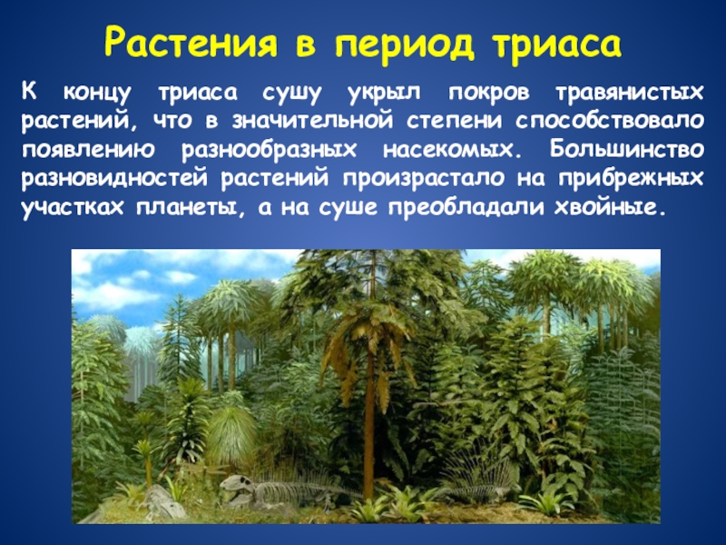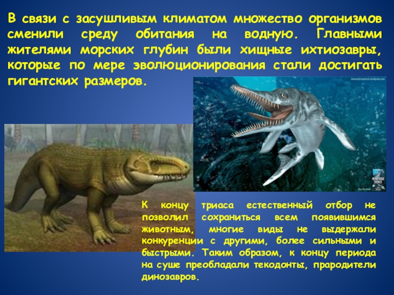 К концу триаса естественный отбор не позволил сохраниться всем появившимся животным, многие виды не выдержали конкуренции с другими, более сильными и быстрыми. Таким образом, к концу периода на суше преобладали текодонты, прародители динозавров.