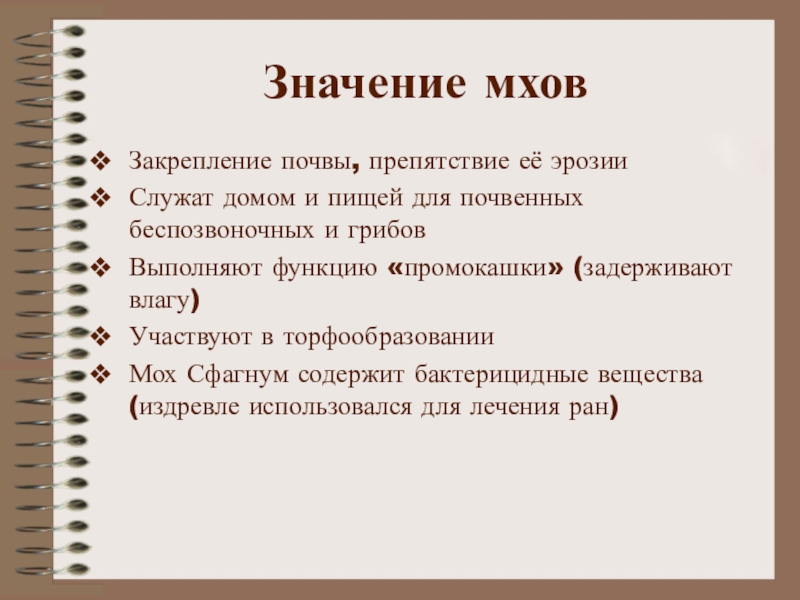 Значение мховЗакрепление почвы, препятствие её эрозииСлужат домом и пищей для почвенных беспозвоночных и грибовВыполняют функцию «промокашки» (задерживают