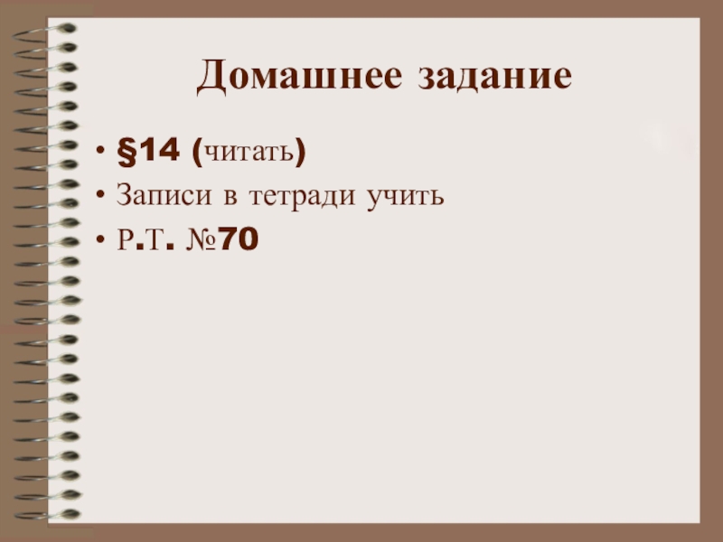 Домашнее задание§14 (читать)Записи в тетради учитьР.Т. №70