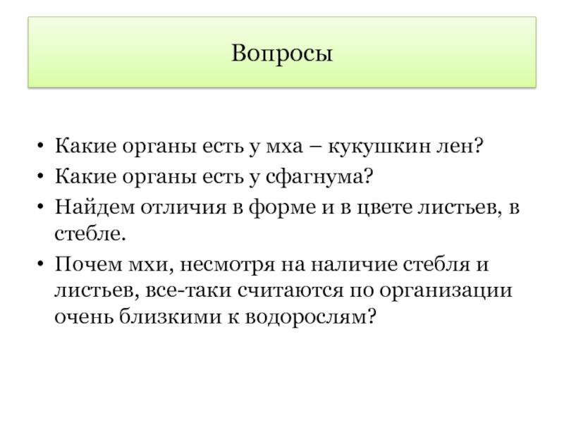 ВопросыКакие органы есть у мха – кукушкин лен?Какие органы есть у сфагнума?Найдем отличия в форме и в