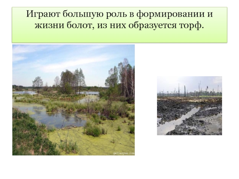Слайд 7Играют большую роль в формировании и жизни болот, из них образуется